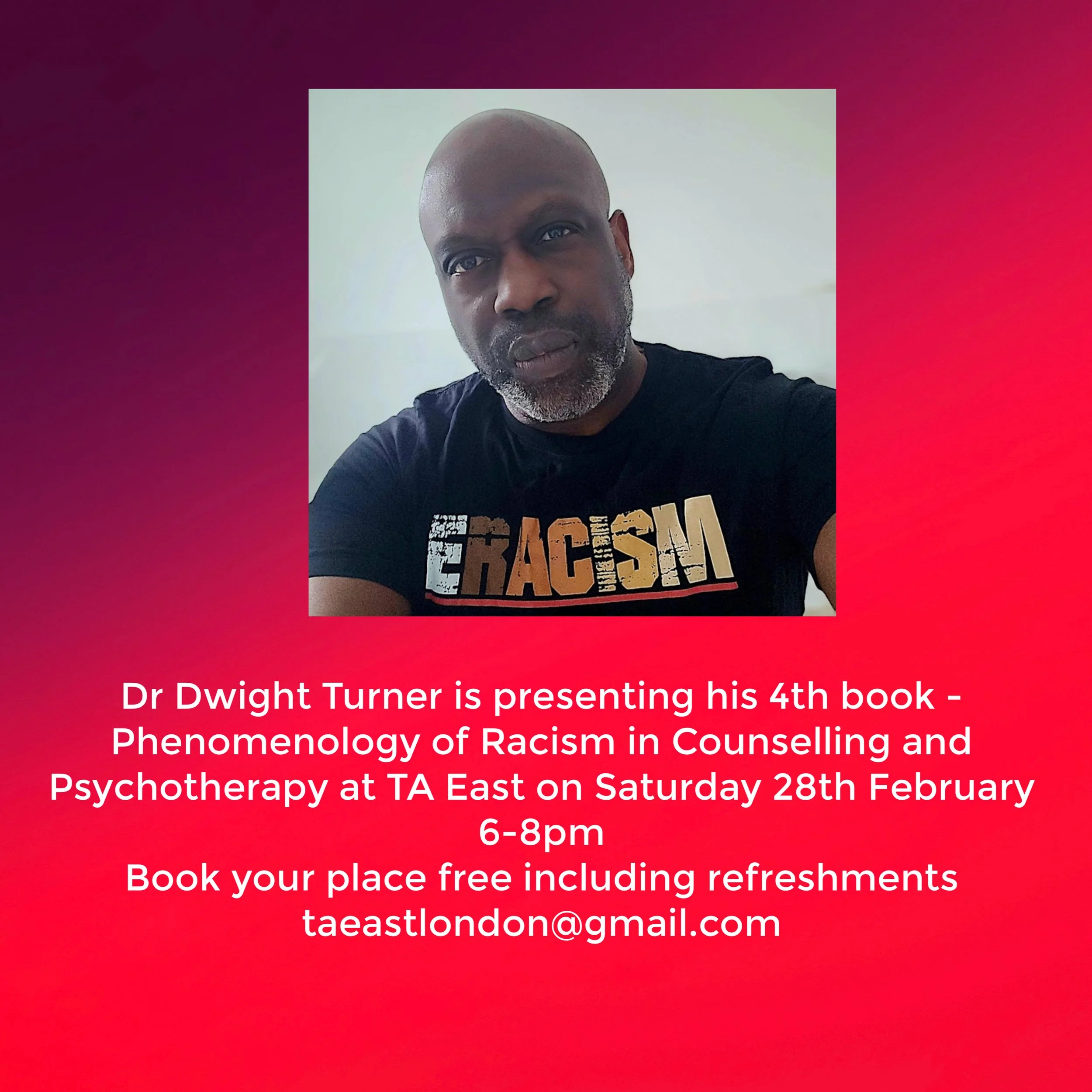 Dr Dwight Turner is presenting his 4th book - Phenomenology of Racism in Counselling and Psychotherapy at TA East