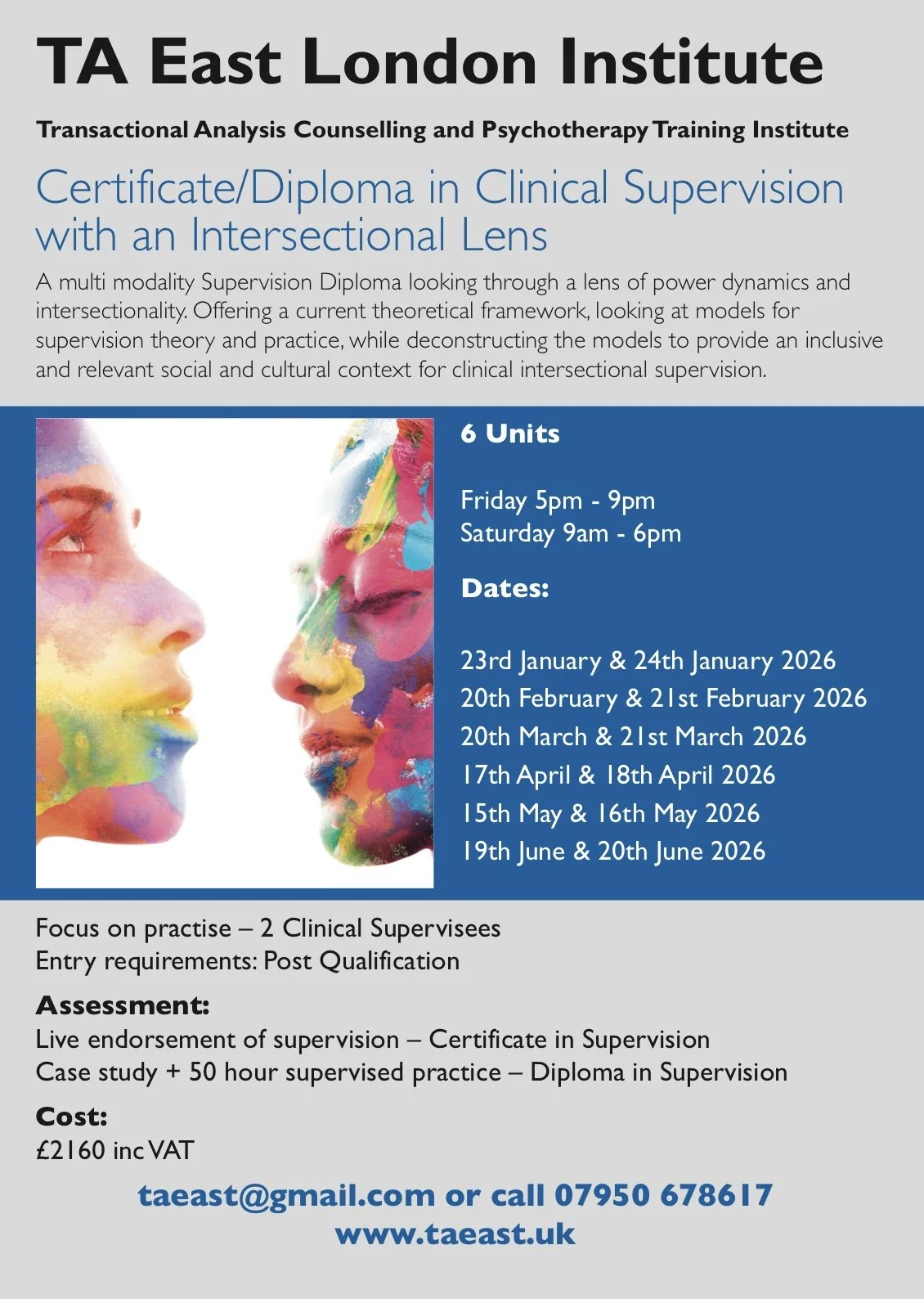The course is a multi modality in person Supervision Diploma looking through a lens of power dynamics and intersectionality. Offering a current theoretical framework, looking at models for supervision theory and practice, while deconstructing the models to provide an inclusive and relevant social and cultural context for clinical intersectional supervision.